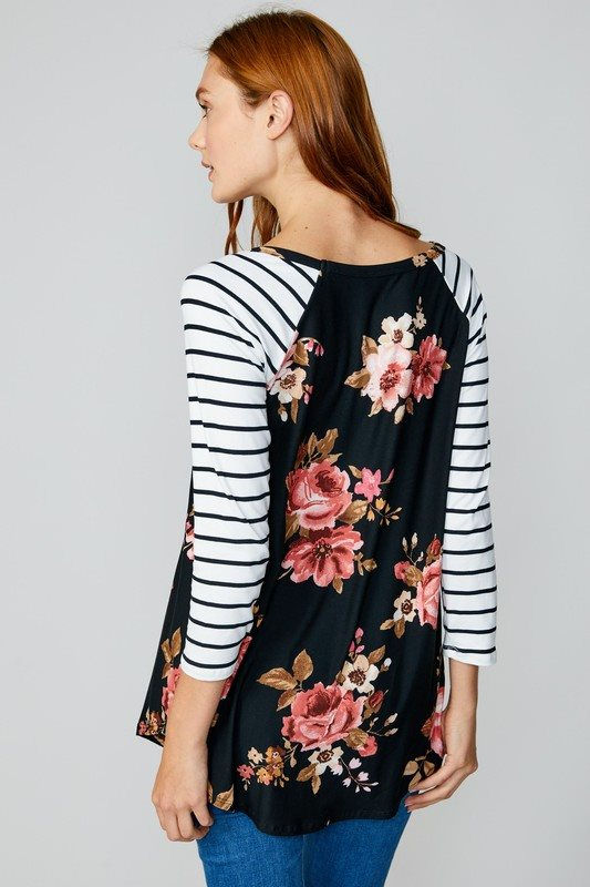 Black Floral Bodice and Striped 3/4 Sleeved Top